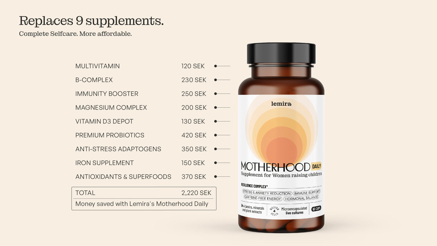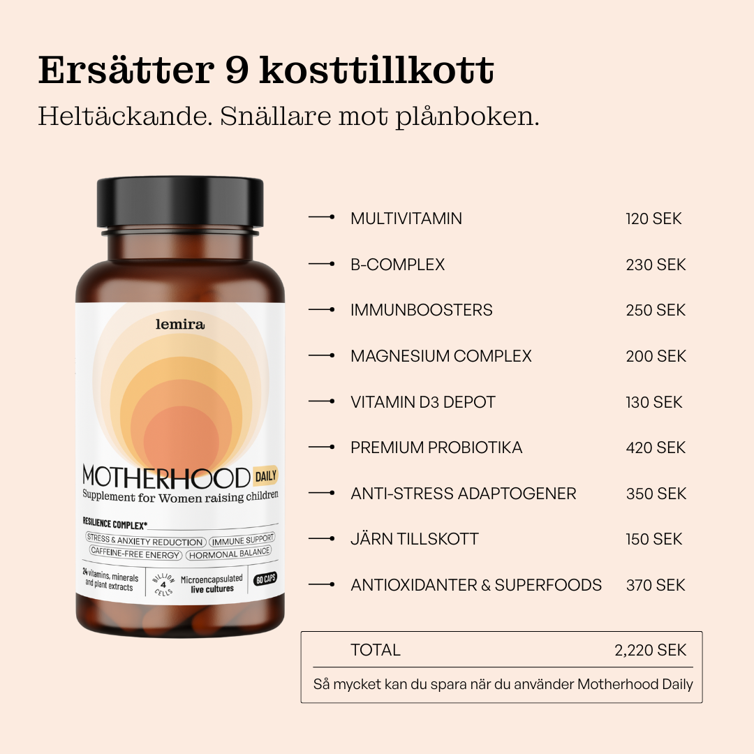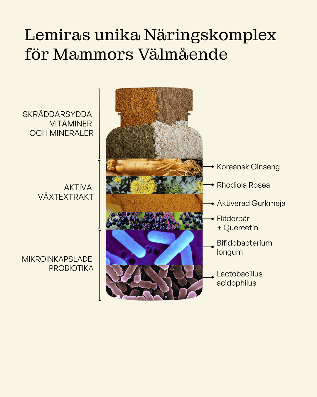 Ingredienser: Kalciumcitrat, vitamin C, marint magnesiumoxid, kapsel (cellulosa), Panax ginseng-rotextrakt, Rhodiola rosea-rotextrakt, fläderextrakt, magnesiumbisglycinat, gurkmejeextrakt, zinkcitrat, järnbisglycinat, japansk pagodträdextrakt (quercetin), Lactobacillus acidophilus, Bifidobacterium longum, linfröoljepulver, niacinamid (vitamin B3), kalcium-D-pantothenat (vitamin B5), kokosbaserat MCT, svartpepparpulver, kolekalciferol (vitamin D3, från lav), DL-alfa-tokoferylsuccinat (vitamin E), menakinon-7 (vitamin K2), betakaroten (Lucarotin® – vitamin A), pyridoxinhydroklorid (vitamin B6), riboflavin (vitamin B2), tiaminhydroklorid (vitamin B1), folsyra (vitamin B9), metylkobalamin (vitamin B12), D-biotin (vitamin B7).