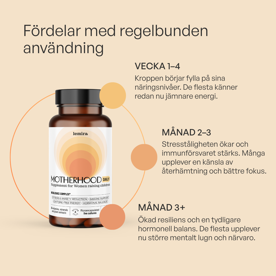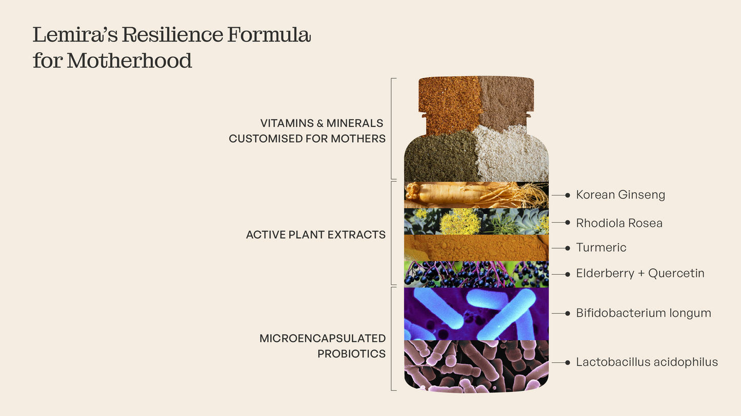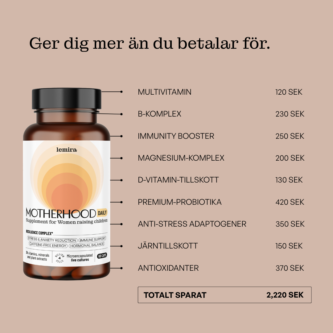 Ingredienser: Kalciumcitrat, vitamin C, marint magnesiumoxid, kapsel (cellulosa), Panax ginseng-rotextrakt, Rhodiola rosea-rotextrakt, fläderextrakt, magnesiumbisglycinat, gurkmejeextrakt, zinkcitrat, järnbisglycinat, japansk pagodträdextrakt (quercetin), Lactobacillus acidophilus, Bifidobacterium longum, linfröoljepulver, niacinamid (vitamin B3), kalcium-D-pantothenat (vitamin B5), kokosbaserat MCT, svartpepparpulver, kolekalciferol (vitamin D3, från lav), DL-alfa-tokoferylsuccinat (vitamin E), menakinon-7 (vitamin K2), betakaroten (Lucarotin® – vitamin A), pyridoxinhydroklorid (vitamin B6), riboflavin (vitamin B2), tiaminhydroklorid (vitamin B1), folsyra (vitamin B9), metylkobalamin (vitamin B12), D-biotin (vitamin B7).